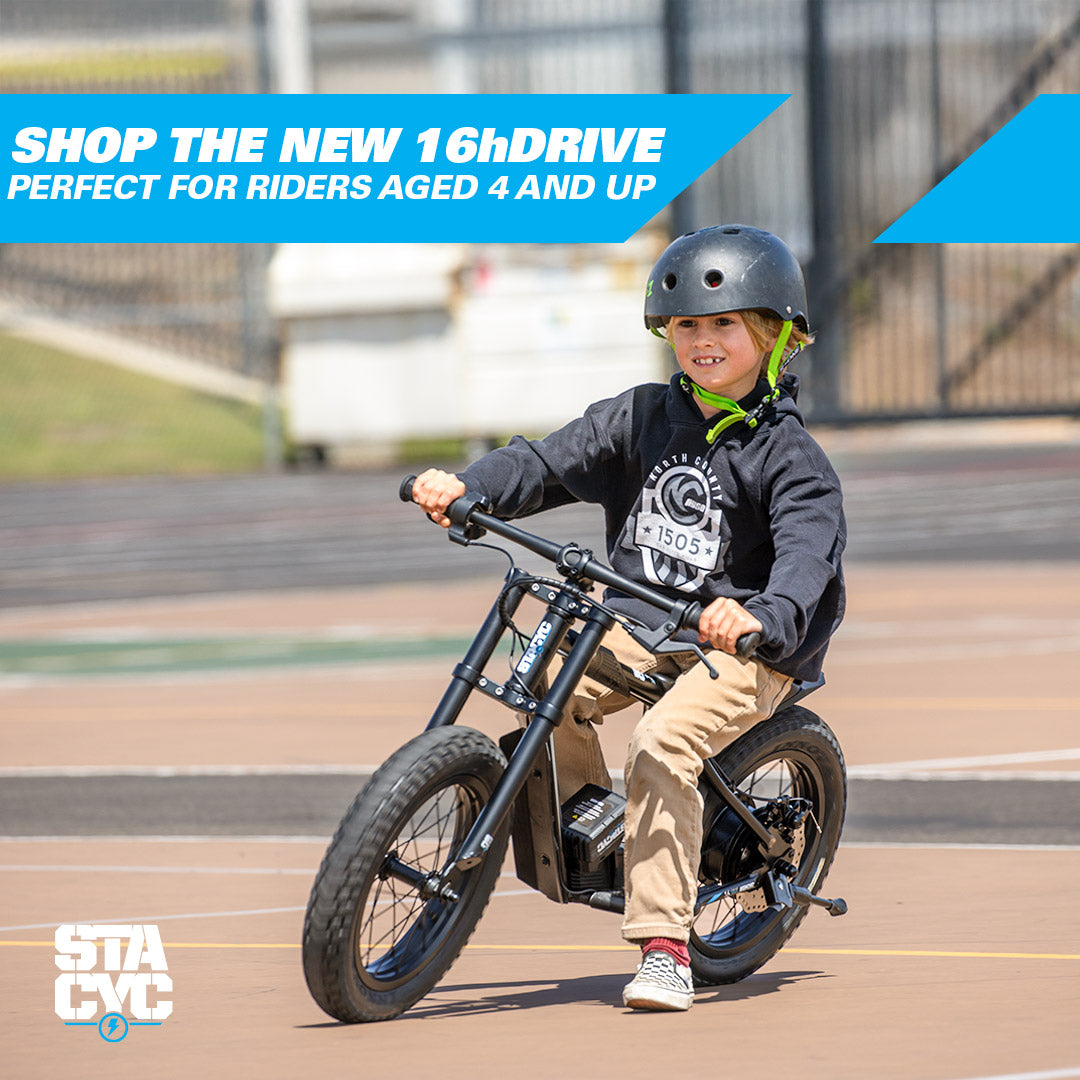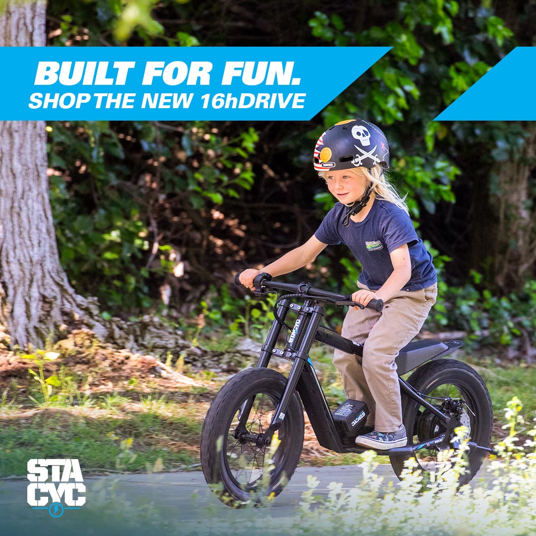 The STACYC 16hDRIVE is an Electric-Powered Balance Bike that helps children 4+ years old develop skills and confidence to get them outside creating experiences with their family and friends.